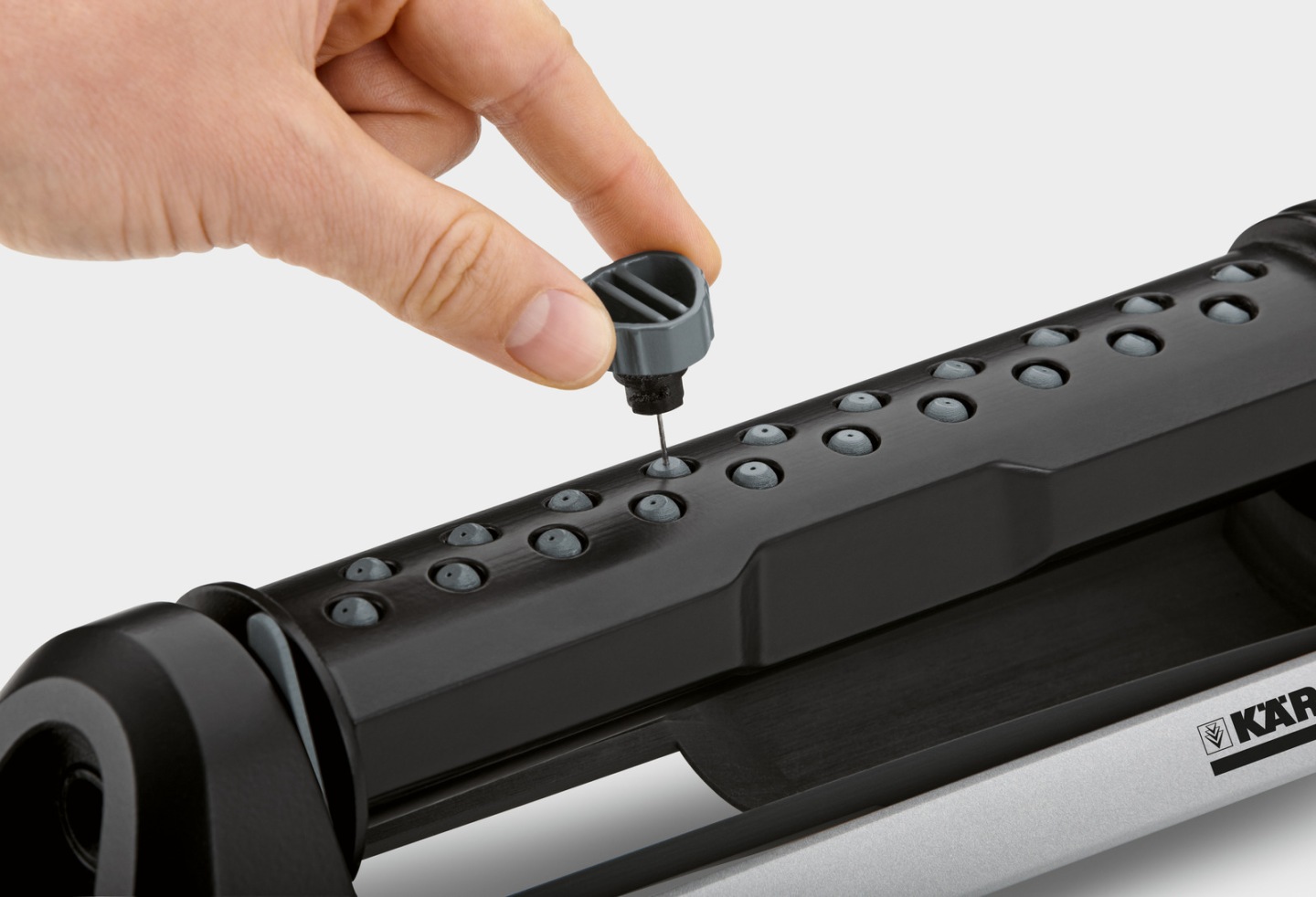 Innowacyjny zraszacz z regulowanym wydatkiem wody (0-maks.). Szerokość spryskiwania można zmniejszyć poprzez wyłączenie części dysz. Wyposażony w zdejmowane szpile. Wśród licznych innowacji, charakteryzujących tą grupę produktów szczególnie warte uwagi jest proste rozwiązanie stosowane w zraszaczach oscylacyjnych Kärcher. Polega ono na wyposażeniu urządzenia w specjalne przesłony umożliwiające zmianę ustawień zraszania bez ryzyka ochlapania wodą osoby obsługującej. Zraszacz współpracuje z systemem szybkozłącza, dlatego jest łatwy w podłączeniu do węża ogrodowego.